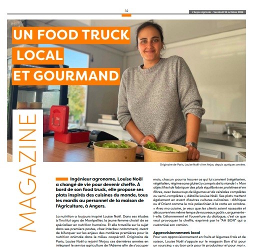 La journaliste Delphine Grosbois est venue voir le fooftruck pour goûter un plat et a conduit une interview par la suite. L'article issu de cet échange est disponible sur le site internet de l'Anjou Agricole Parmi les citations parlantes dans l'article, la volonté de développer le volet pédagogique autour de plats servis , notamment au cours des prestations traiteur pour les entreprises à Angers et aux alentours :" L'alimentation rassemble, rappelle-t-elle. Et cette prestation pourrait tout à fait s'inscrire dans le programme RSE des entreprises, ou dans le cadre de la cohésion d'équipe".